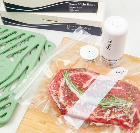 Take your Suvie to the next level with our Sous Vide Kit. This complete set includes reusable, BPA-free sous vide bags, a battery-powered vacuum pump, and weights to keep your bags submerged during cooking. Perfectly cooked meals await!